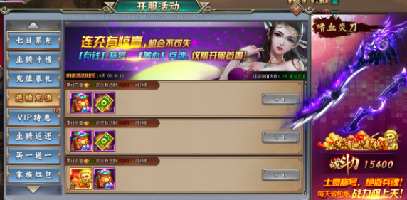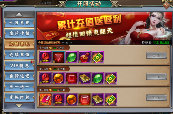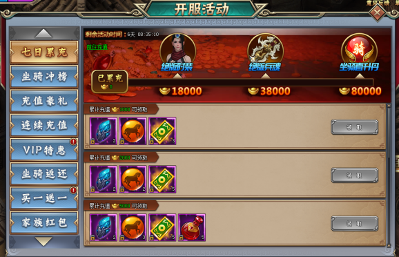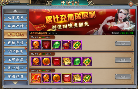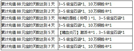 活动期间玩家累计充值88元宝达到相应天数,即可领取相应档位道具奖励