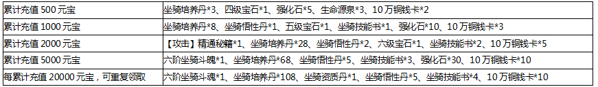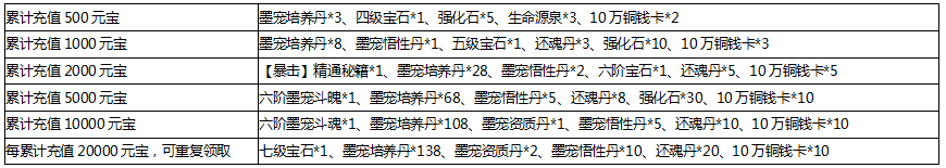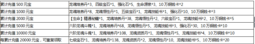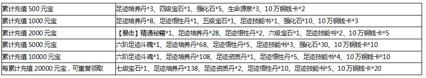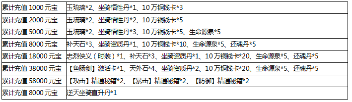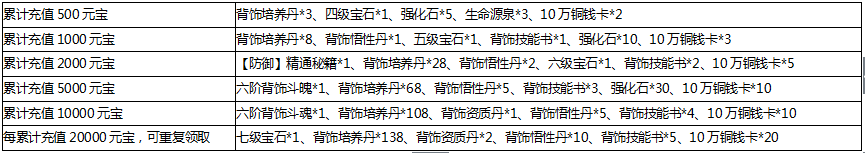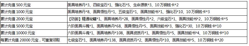 奖励领取条件:活动期间玩家累计充值相应金额,即可领取对应档位道具奖励