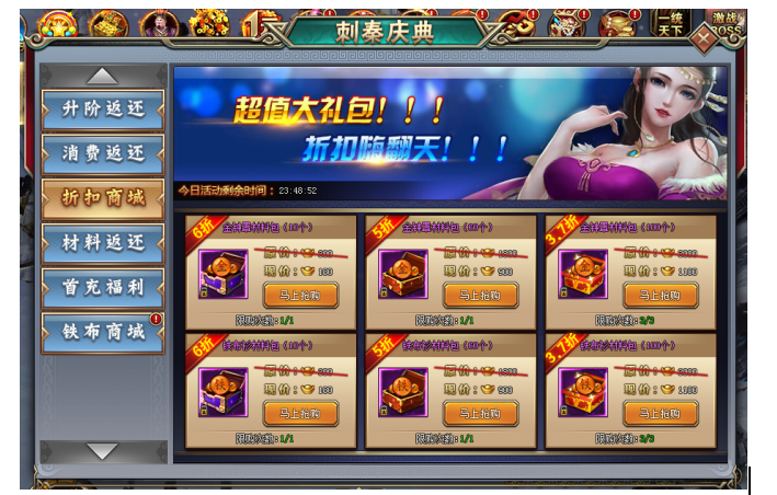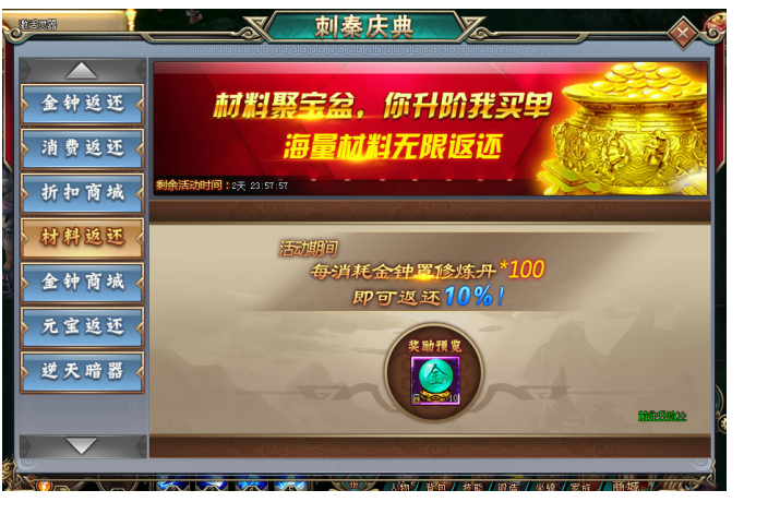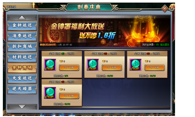 1. 活动期间,玩家可花费元宝购买铁布衫材料包和金钟罩材料包,超低折数,绝对超值!
