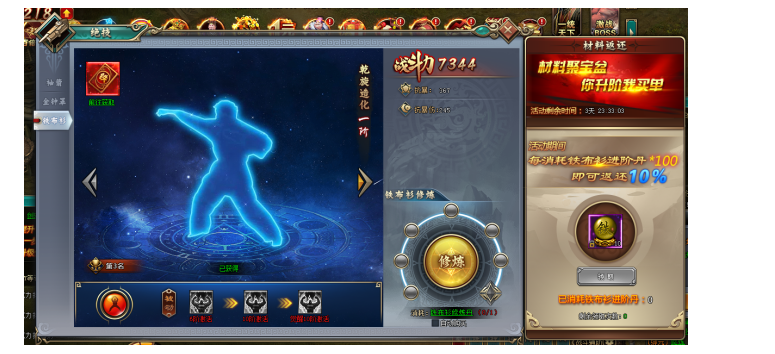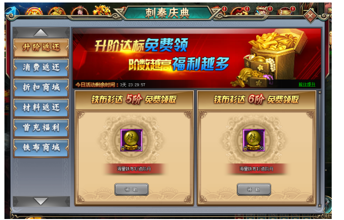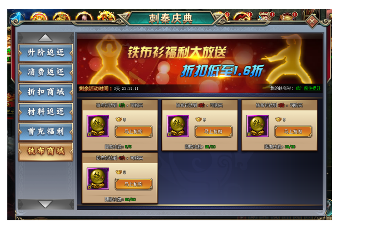 1. 活动期间,玩家铁布衫升级至指定阶数,即可以超低价格购买铁布衫进阶丹