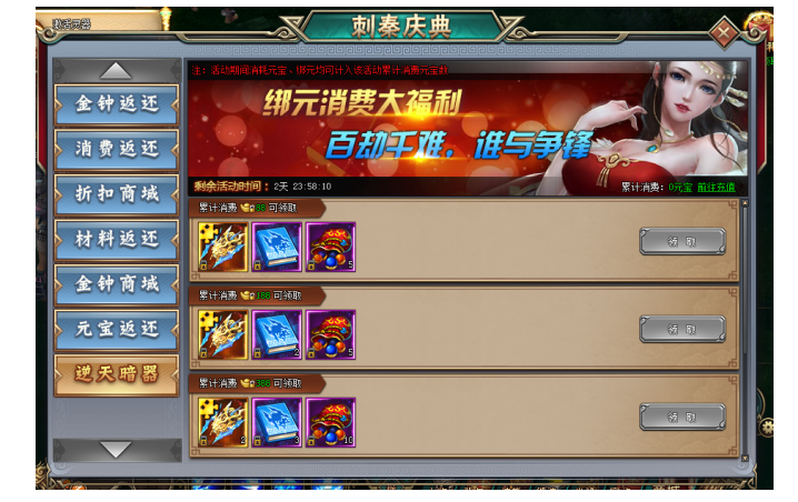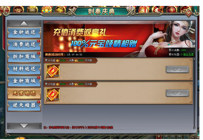 1. 活动期间,玩家累计消费达到指定元宝,即可领取丰厚奖励