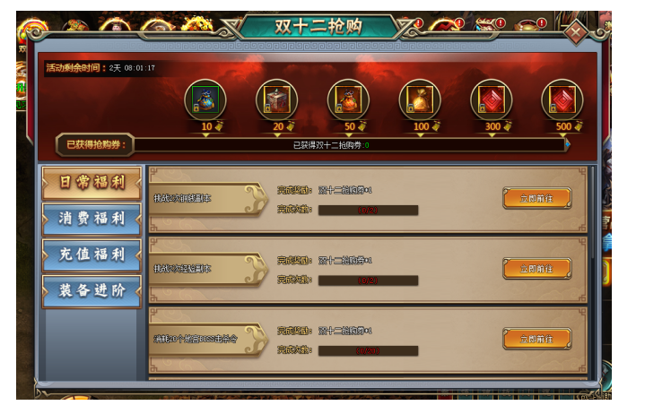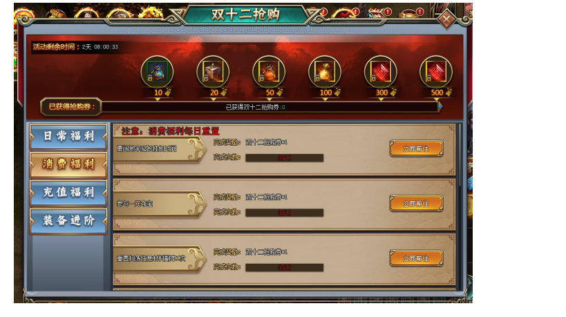 铜钱副本多倍卡100%领取2次 | 双十二抢购券*2 | |
