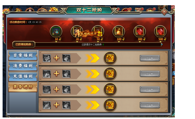 2. 收集双十二抢购券达到指定数量,即可领取超级经验战魂袋、七级宝石等珍稀奖励