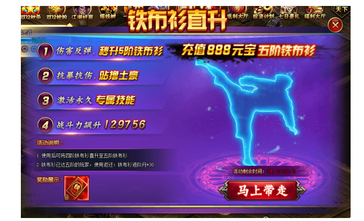 【活动内容】活动期间,玩家累计充值888元宝,即可领取铁布衫五阶直升卡,秒升五阶铁布衫!