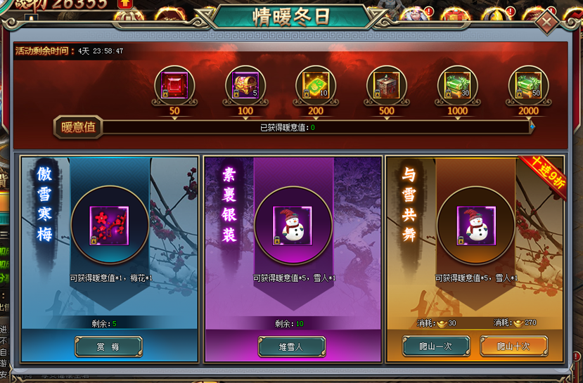 3. 与雪共舞:可通过消耗30元宝爬山一次,也可直接消耗270元宝爬山十次,每次爬山可获得暖意值和雪人,开启雪人可获得随机道具奖励