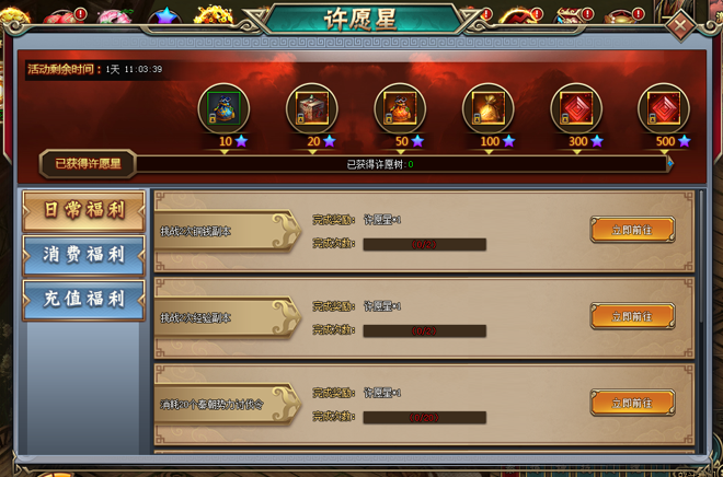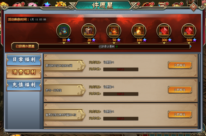1. 活动期间,玩家可通过完成目标任务或者充值,获取许愿星