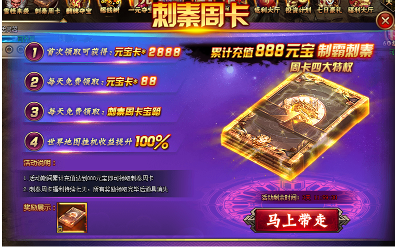 【活动内容】活动期间,累计充值888元宝即可领取刺秦周卡,享受持续领取七天的福利待遇