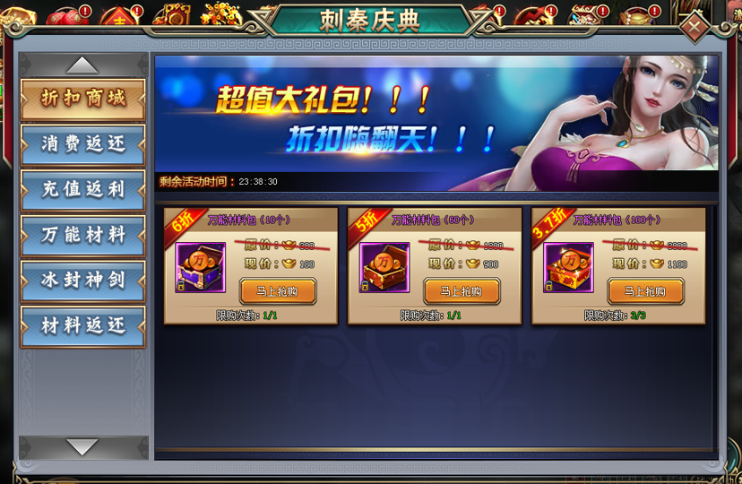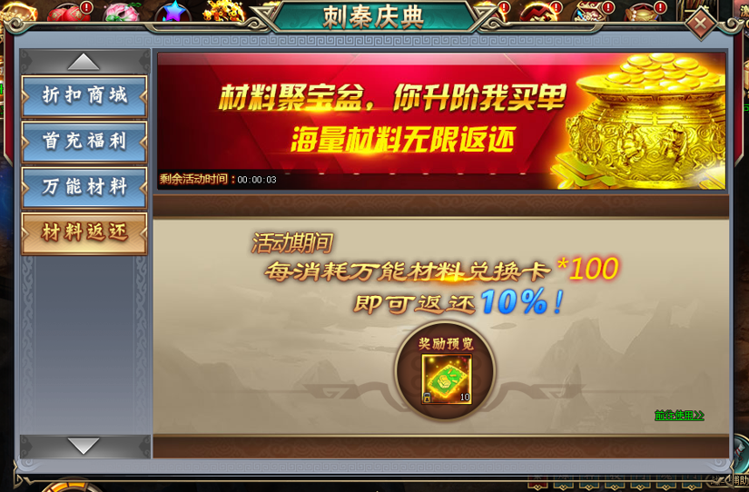 3. 活动期间,玩家可花费元宝购买万能材料包,超低折数,绝对超值!