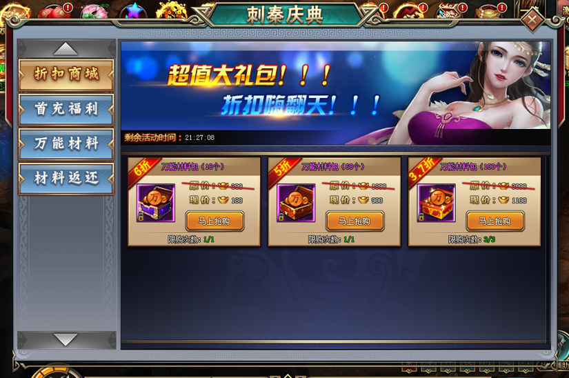 1. 活动期间,玩家可花费元宝购买万能材料包,超低折数,绝对超值!