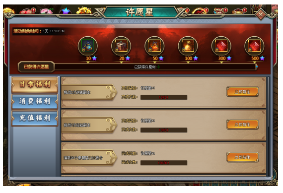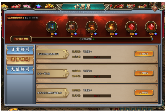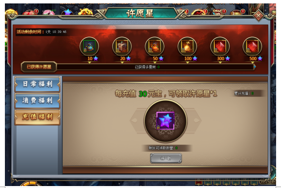 1. 活动期间,每充值30元宝,可领取许愿星*1