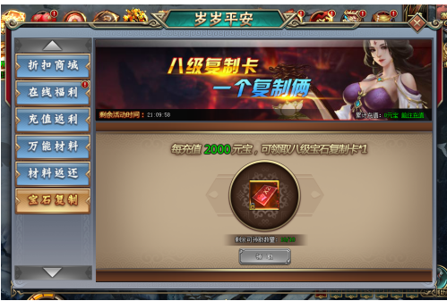 1. 活动期间,玩家每充值2000元宝即可在活动界面领取八级宝石复制卡*1