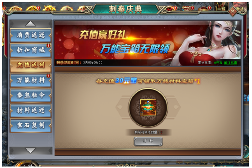 1. 活动期间,每充值30元宝即可领取万能材料宝箱*1
