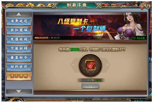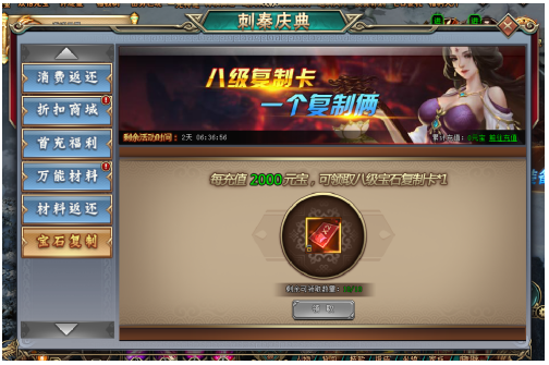 5. 活动期间,玩家每充值2000元宝即可在活动界面领取八级宝石复制卡*1