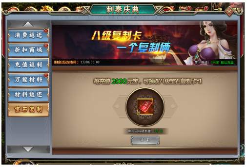 3. 活动期间,玩家每充值2000元宝即可在活动界面领取八级宝石复制卡*1