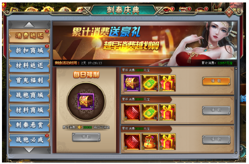2. 累计消费达到20000元宝的玩家,每日还可领取额外奖励,越早消费越早领取哦~