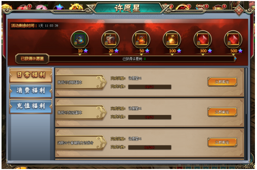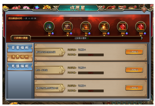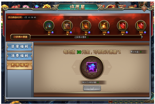 1. 活动期间,每充值30元宝,可领取许愿星*1
