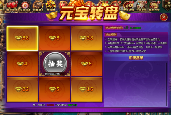 1. »î¶¯ÆÚ¼ä£¬ÀۼƳäÖµ´ïµ½Ö¸¶¨Ôª±¦¼´¿É²ÎÓëÔª±¦×ªÅ̳齱»î¶¯£¬³éȡԪ±¦½±Àø