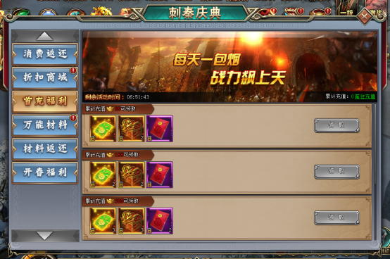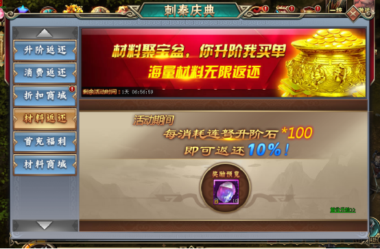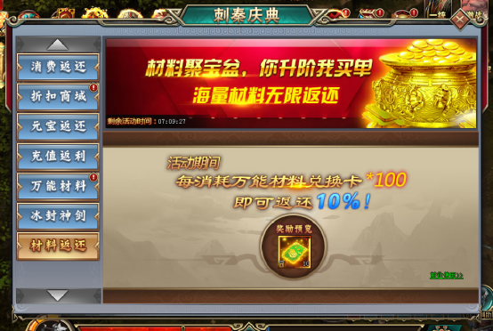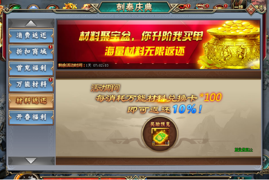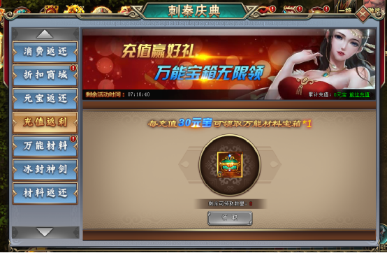 1. 活动期间,每充值30元宝即可领取万能材料宝箱*1