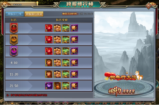 第1名: | 10级铭文*3 | 称号:狗年行大运 | 战神神兵宝箱*100 | 神兵宝盒*500 |