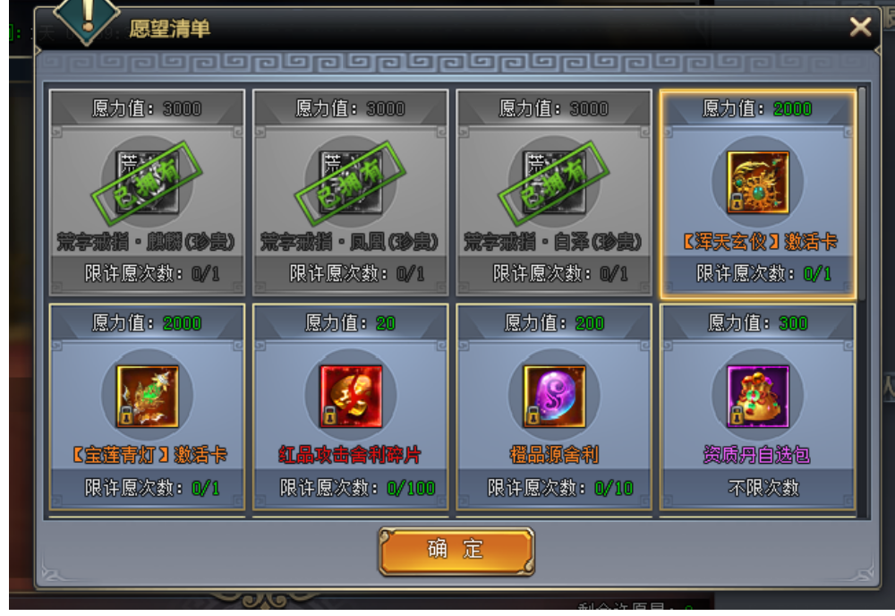 4. 当愿力值达到选中的许愿道具需求值时,下一次许愿必定获得该道具