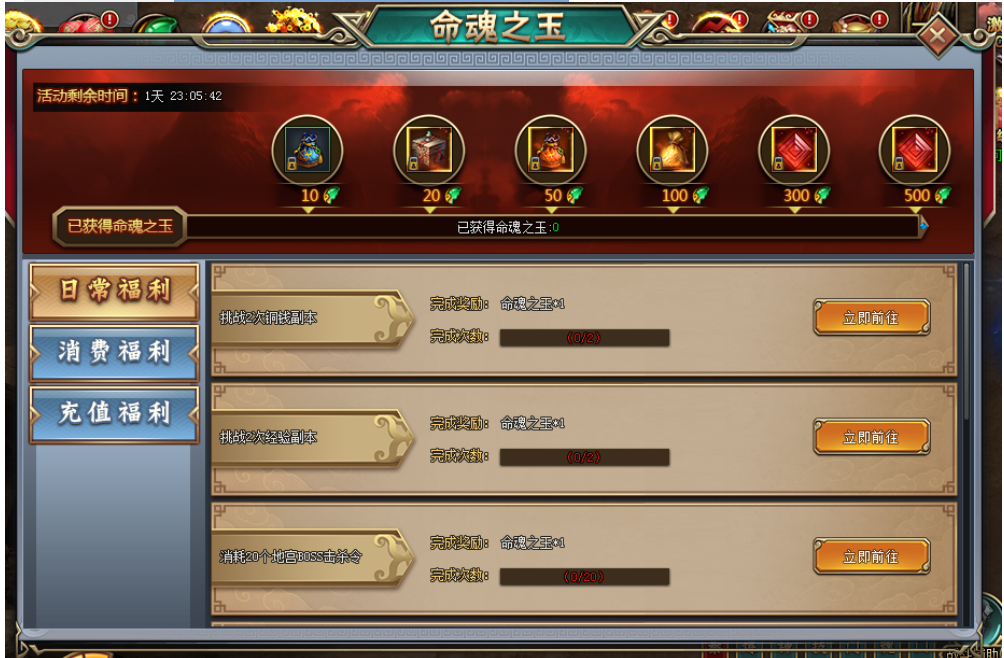 铜钱副本 | 挑战2次铜钱副本 | 命魂之玉(限)*1 |