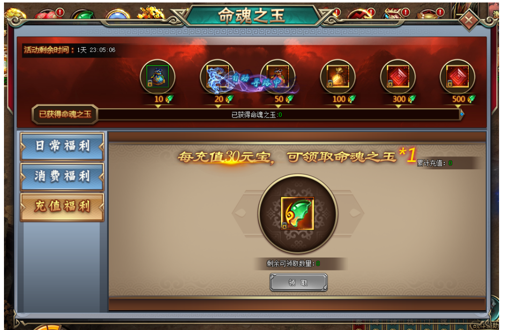 1. 活动期间,每充值30元宝,可领取命魂之玉*1