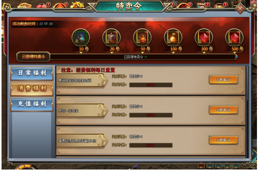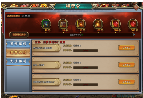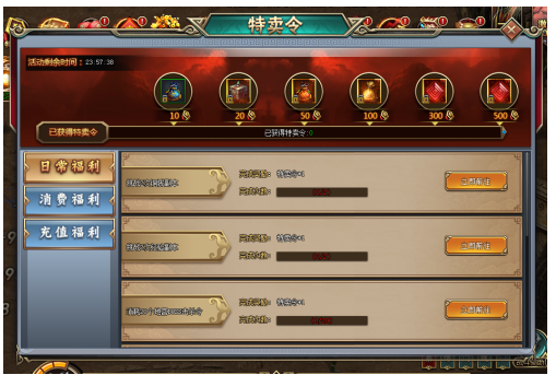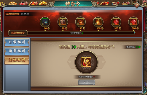 1. 活动期间,每充值30元宝,可领取特卖令*1