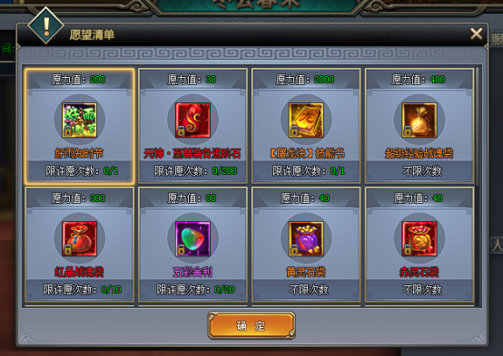 4. 当愿力值达到选中的许愿道具需求值时,下一次许愿必定获得该道具