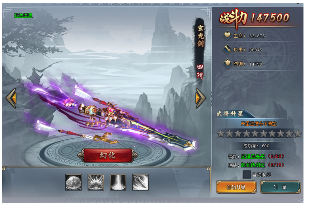 2. 御剑共有10阶,每阶20星,可消耗指定材料进行升星,满星后可升阶,获得大量属性及酷炫外观