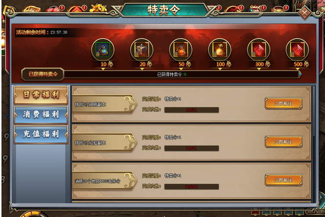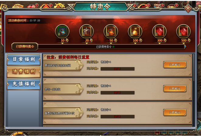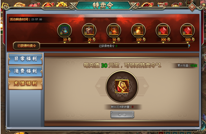 1. 活动期间,每充值30元宝,可领取特卖令*1