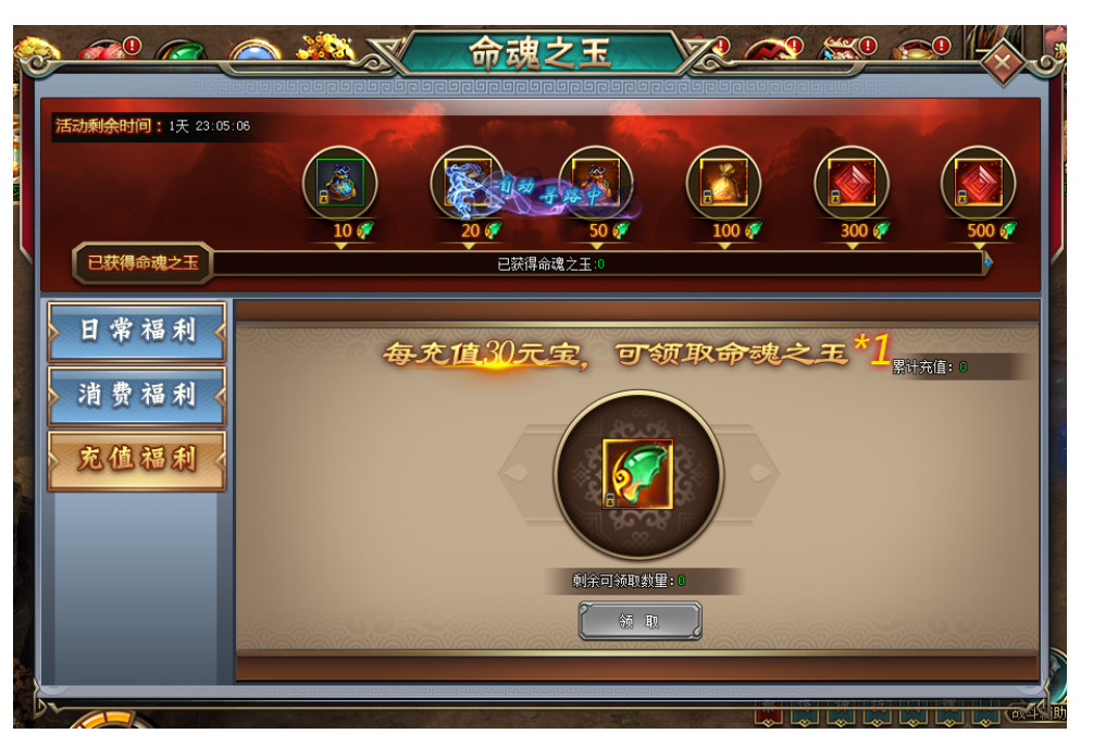 1. 活动期间,每充值30元宝,可领取命魂之玉*1