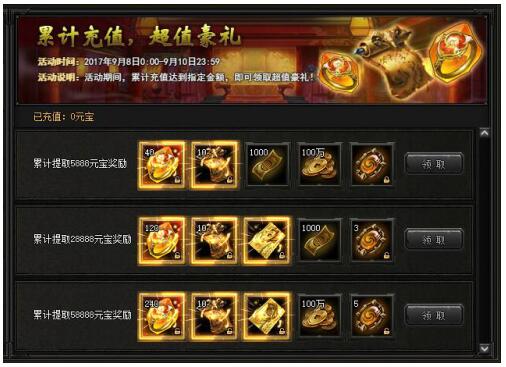 【活动内容】活动期间,累计充值达到指定金额,即可领取超值豪礼!