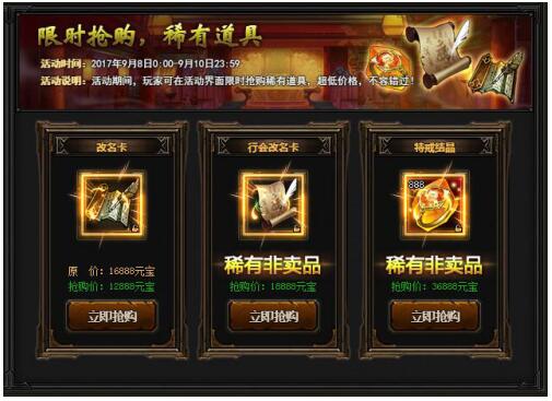 【活动内容】活动期间,玩家可在活动界面限时抢购稀有道具,超低价格,不容错过!(活动期间仅可购买一次)