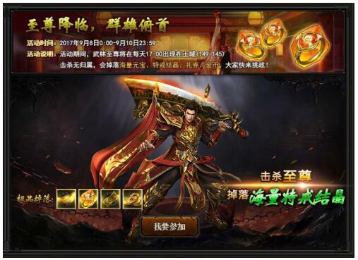 【活动内容】活动期间,武林至尊将在每天17:00出现在土城(149.145),击杀至尊将会掉落海量元宝、礼券、特戒结晶,大家快来打至尊!(注:至尊掉落无归属)