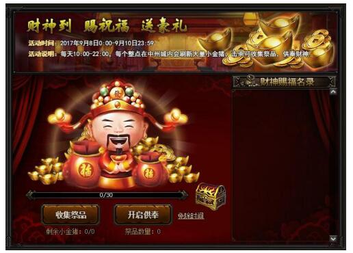 【活动内容】活动期间,财神赐福,供奉财神将有机会获得大量财物赏赐!每天10点-22点,每个整点在中州城内会刷新大量小金猪,击杀小金猪可以获得祭品,用于供奉财神。