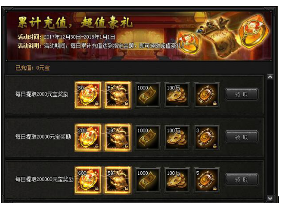 【活动内容】活动期间,每日充值达到指定金额,即可领取超值豪礼!