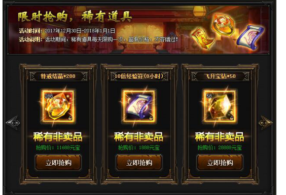 【活动内容】活动期间,稀有道具每天限购一次,超低价格,不容错过!