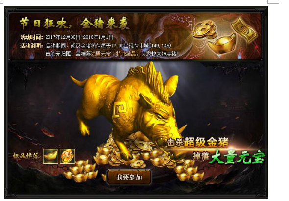 【活动内容】活动期间,超级金猪将在每天17:00出现在土城(149.145),击杀超级金猪将会掉落海量元宝、礼券、特戒结晶,大家快来抢金猪!(注:超级金猪掉落无归属)