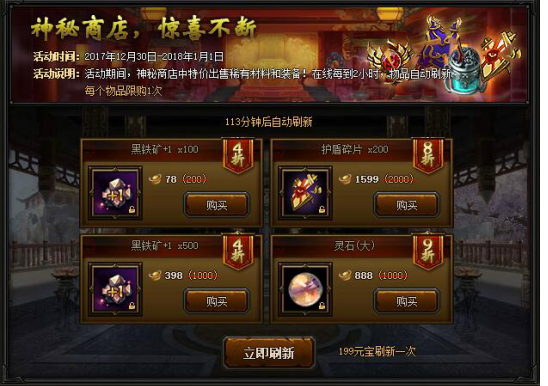 【活动内容】活动期间,神秘商店限时开启,稀有材料超低价格出售,不容错过!每过2小时,商店物品自动刷新,消耗199元宝可立即刷新,每个物品限购一次。