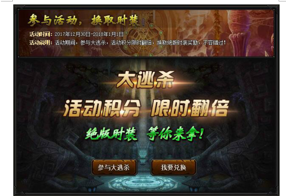 【活动内容】活动期间,参与大逃杀,活动积分限时翻倍,换取绝版时装奖励,不容错过!