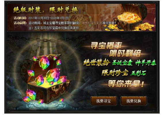 【活动内容】活动期间,城主宝藏寻宝概率限时翻倍,绝世珍宝五彩石等你来拿!