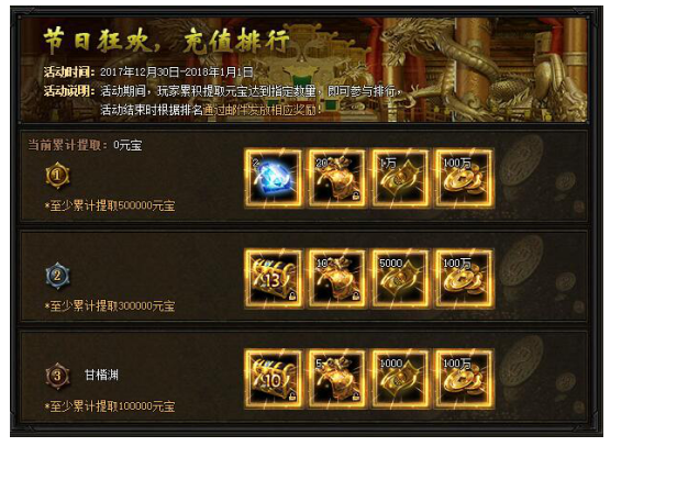 【活动内容】活动期间,累计提取元宝达到指定金额,即可参与排行。