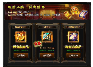 【活动内容】活动期间,稀有道具每天限购一次,超低价格,不容错过!