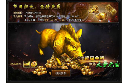 【活动内容】活动期间,超级金猪将在每天17:00出现在土城(149.145),击杀超级金猪将会掉落海量元宝、礼券、特戒结晶,大家快来抢金猪!(注:超级金猪掉落无归属)