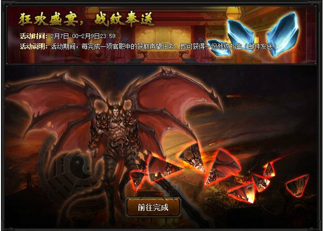 【活动内容】活动期间,每完成一项官职中的获取声望任务,即可获得一份战纹礼盒!(邮件发送)