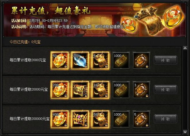 【活动内容】活动期间,累计充值达到指定金额,即可领取超值豪礼!