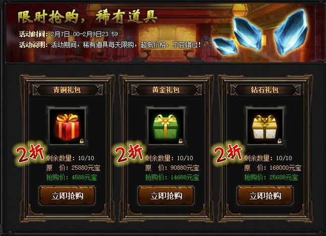 【活动内容】活动期间,玩家可在活动界面限时抢购稀有道具,超低价格,不容错过!(活动期间每天限购10次)