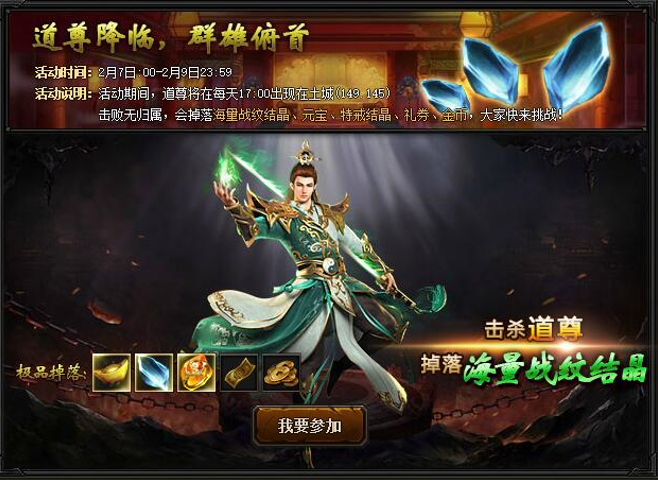 【活动内容】活动期间,道尊将在每天17:00出现在土城(149.145),击杀道尊将会掉落海量战纹碎片、元宝、礼券、特戒结晶,大家快来打道尊!(注:道尊掉落无归属)