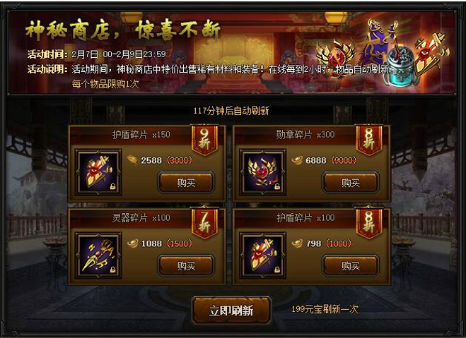 【活动内容】活动期间,神秘商店限时开启,稀有材料超低价格出售,不容错过!每过2小时,商店物品自动刷新,消耗199元宝可立即刷新,每个物品限购一次。