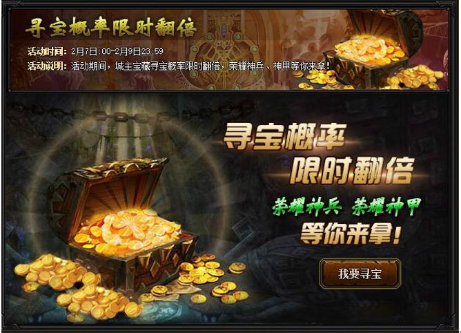 【活动内容】活动期间,城主宝藏寻宝概率限时翻倍,荣耀神兵、荣耀神甲等你来拿!
